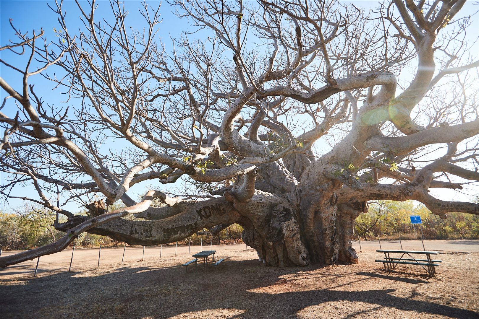 The Boab Prison Tree in Derby is one of the most intriguing and historic landmarks in Western Australia's Kimberley region. This ancient and enormous Boab, estimated to be around 1,500 years old, features a hollow trunk with a circumference of over 14 meters. The tree's unique, cavernous interior has given rise to its name and historical significance.